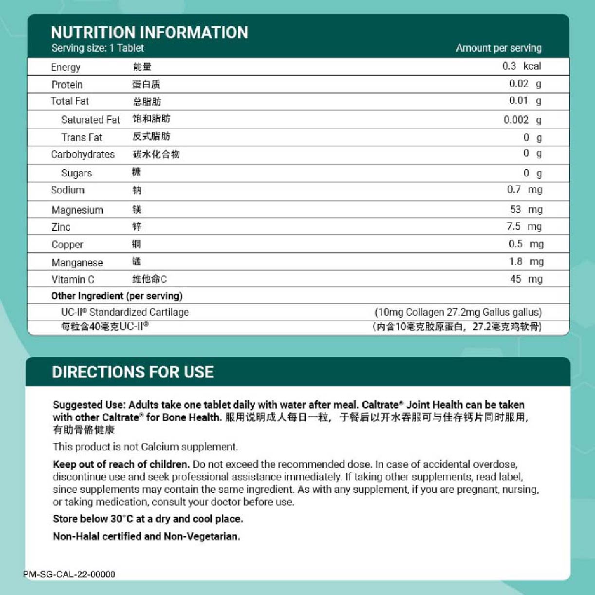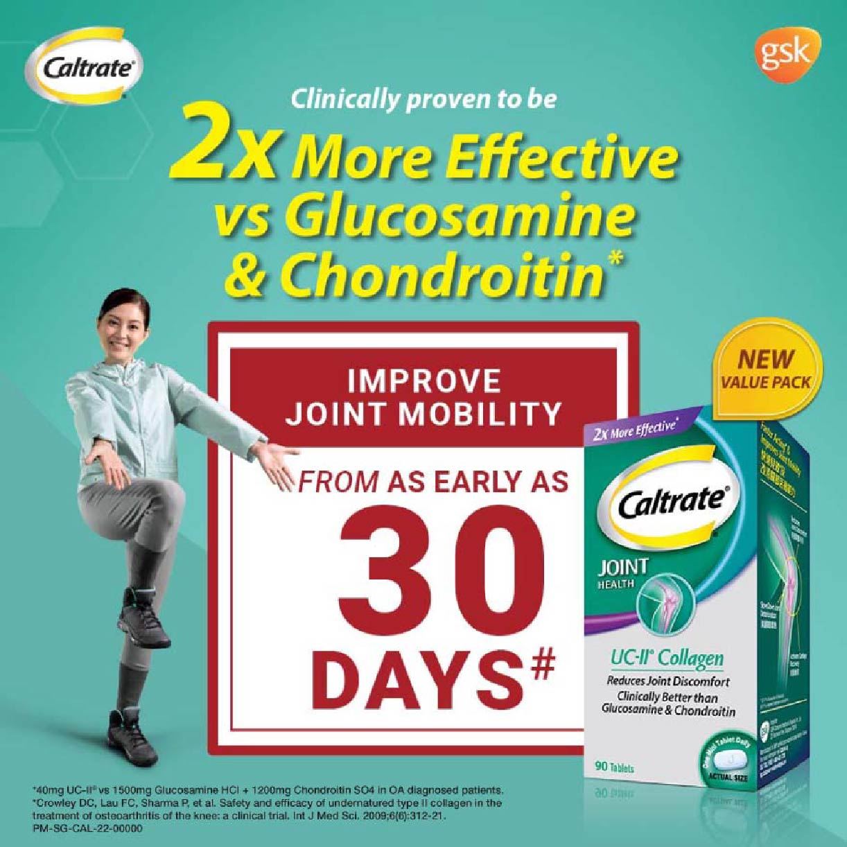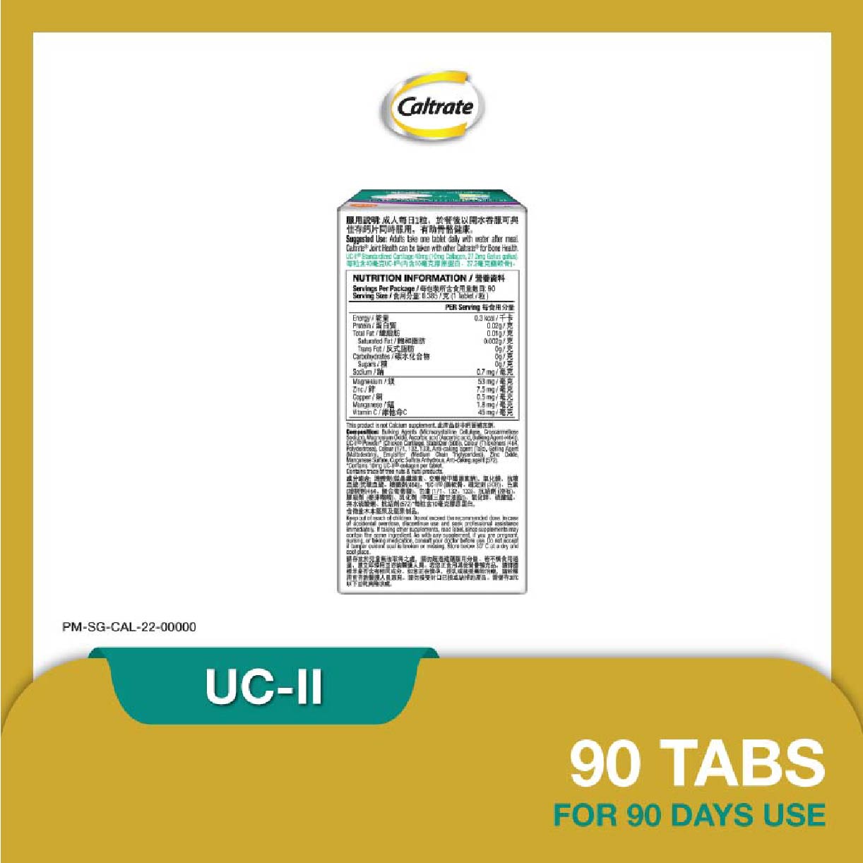 Caltrate Joint Health UC-II Collagen Supplement Tablet (2X More Effective vs Glucosamine + Reduce Joint Discomfort) 90s Support your joint health with the Caltrate Joint Health Undenatured Collagen Type II (UC-II). Caltrate Joint Health UC-II contains UC-II undenatured collagen type II, a patented ingredient that has been clinically tested to reduce joint discomfort and promote healthy cartilage and joint flexibility for healthier and longer active living. MAHS2000216 **Where applicable, items have a minimum of nine-month shelf life before expiry unless otherwise stated on product description.
