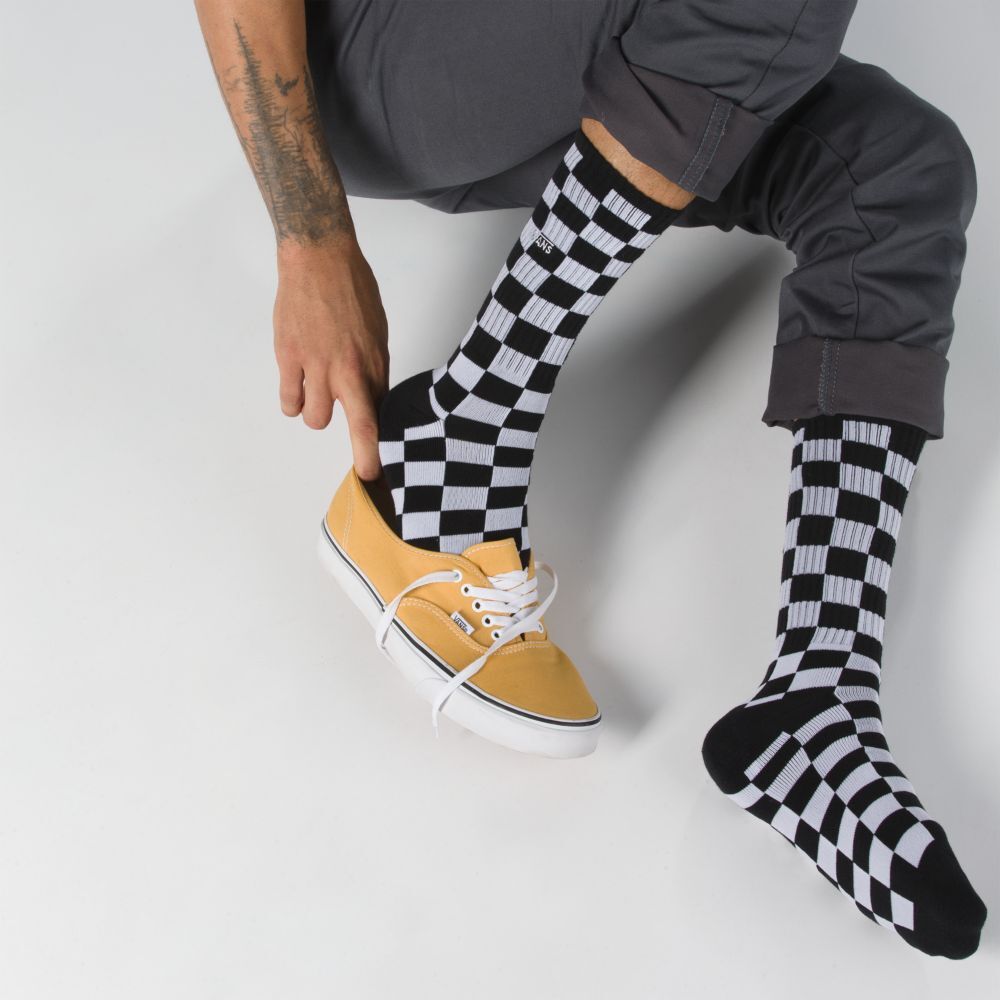 The Checkerboard Crew Sock is a 48% nylon, 47% cotton, 4% elastodiene, and 1% elastane crew sock featuring allover checkerboard jacquard art and an embroidered Vans logo.