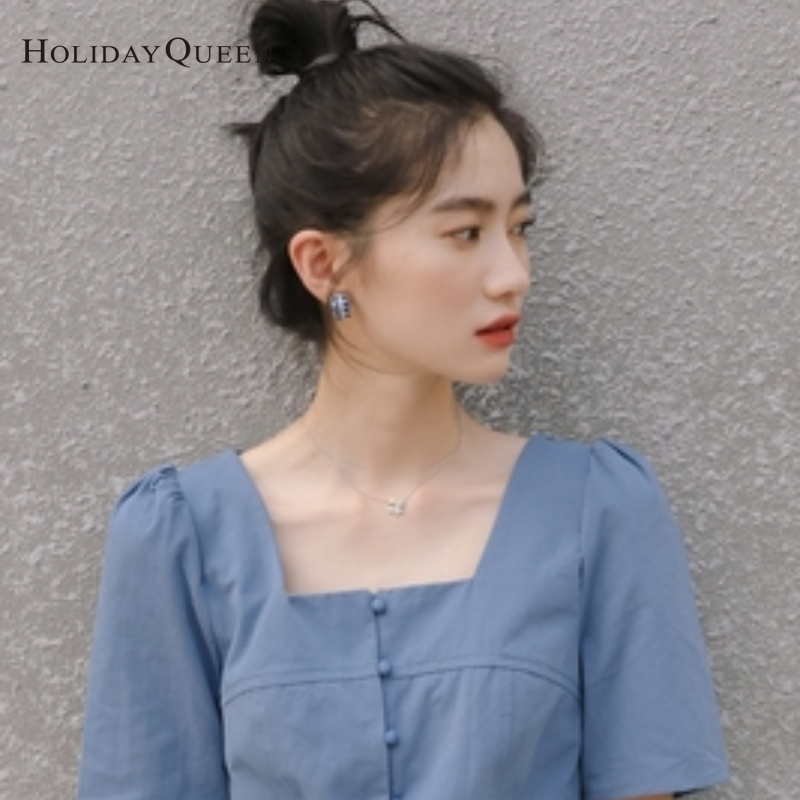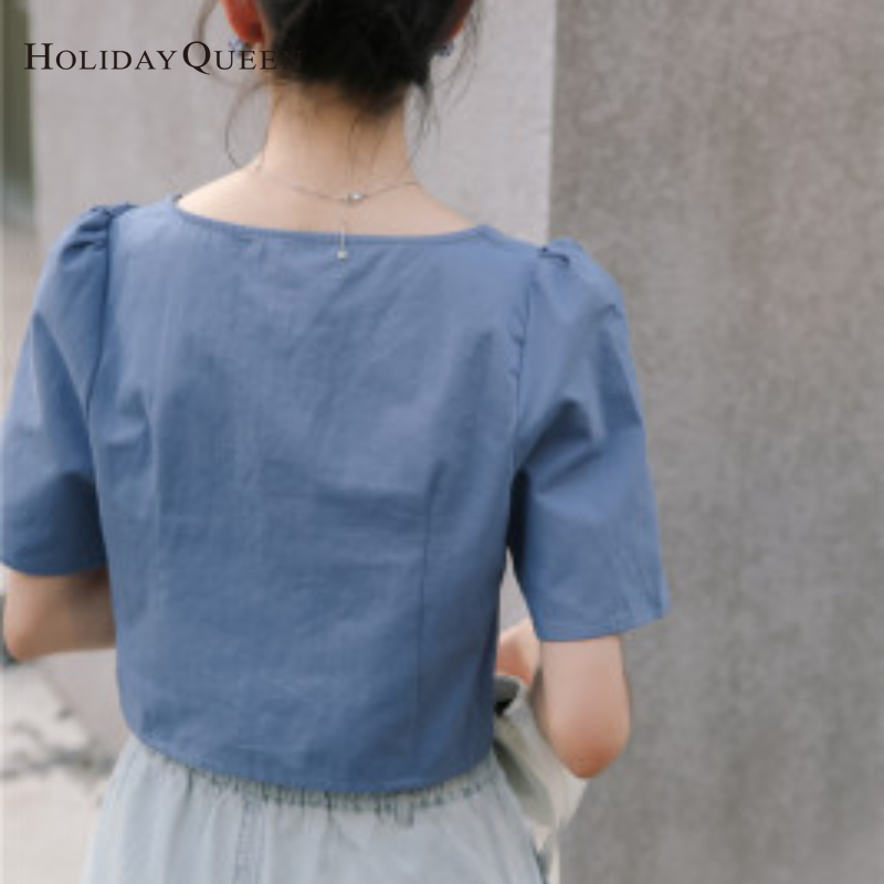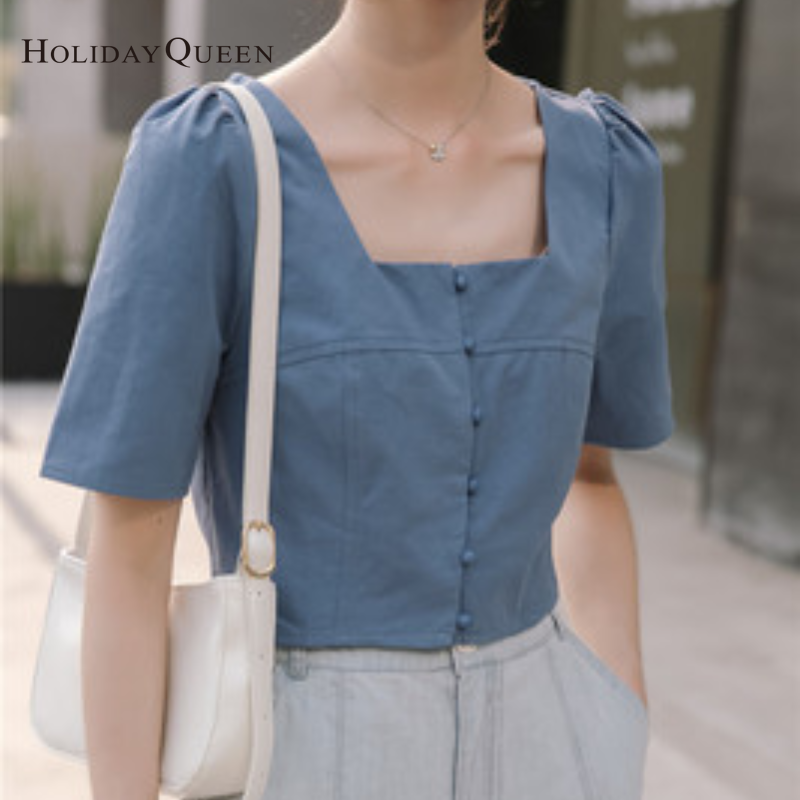 HolidayQueen Summer New Design Short Puff Sleeve Single-breasted Women's Fashion Square Collar Leaky Clavicle Shirt Top Free Shipping HQT0109
