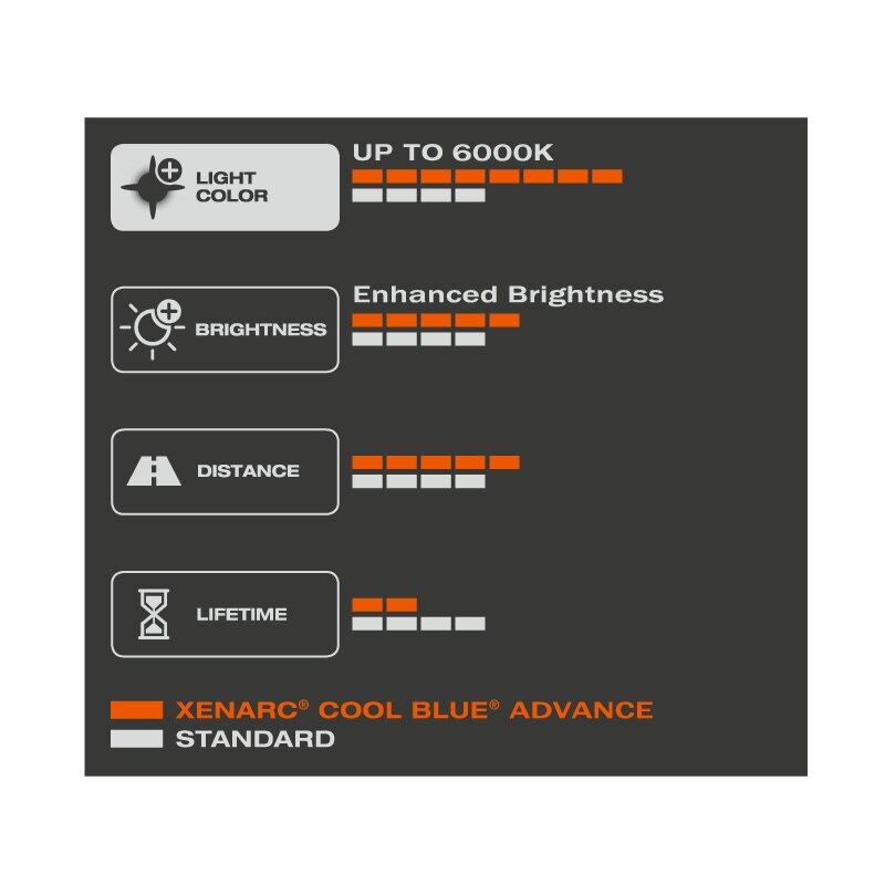 XENARC COOL BLUE ADVANCE convinces with mega white xenon light and high color temperatures of up to 6,000 K. This is due to a special filling system instead of conventional coating. These products do not have ECE approval.