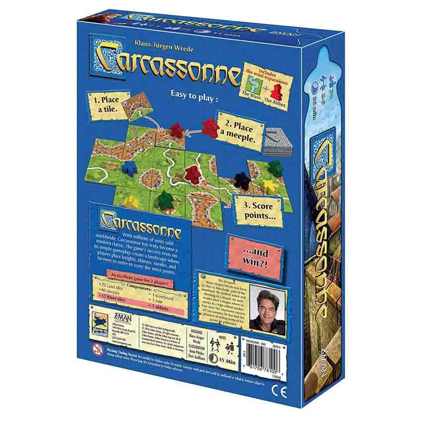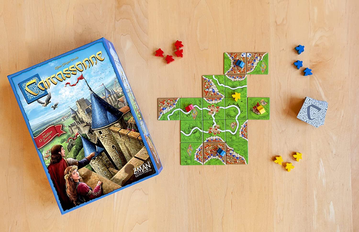 ONE STEP AT A TIME TILE-PLACEMENT GAME: Players fill in the countryside around the medieval fortified city, choosing from tiles that depict cities, roads, monasteries, and fields; each new tile creates an ever-expanding board on which players can then add their followers.