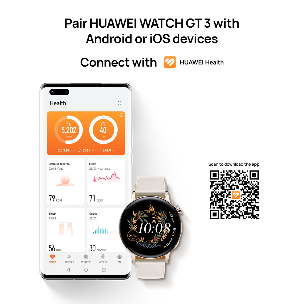 【Durable Battery Life】On afull charge, HUAWEI WATCH GT 3 42 mm lasts up to 7 days, so you're fullyprepared to keep track of your every workout and not miss out on any healthcheck. It supports wireless charging, so you can use your phone to reversecharge it when you forget your charger and say goodbye to battery life anxiety.