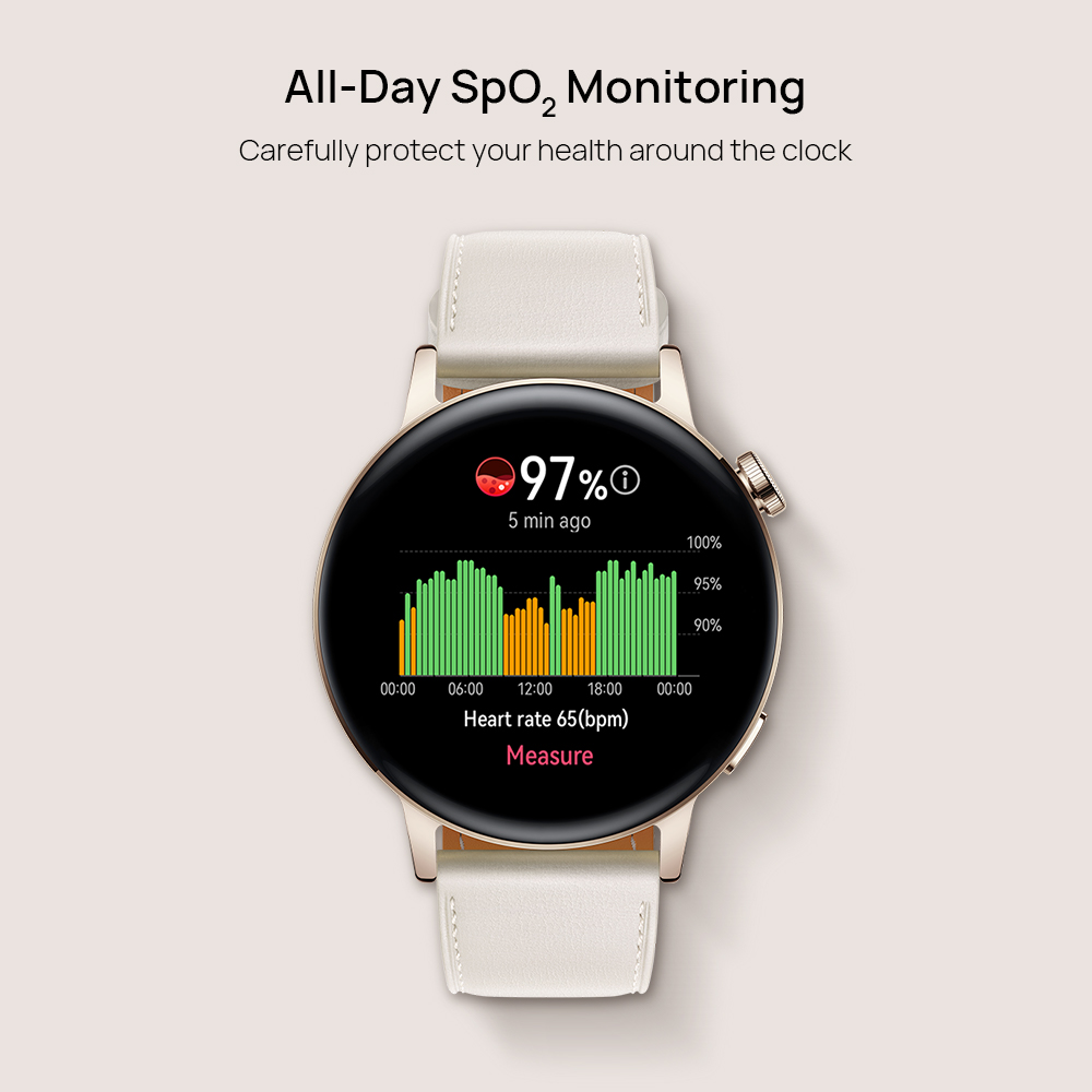 【All-Day SpO2 Monitoring】Bloodoxygen saturation (SpO2) is one of the important vital signs that can reflectthe oxygen supply of the body. HUAWEI WATCH GT 3 smartwatch automaticallyprovides 24-hour SpO2 level detection no matter when you are working,exercising or sleeping, which carefully protecting your health around theclock.