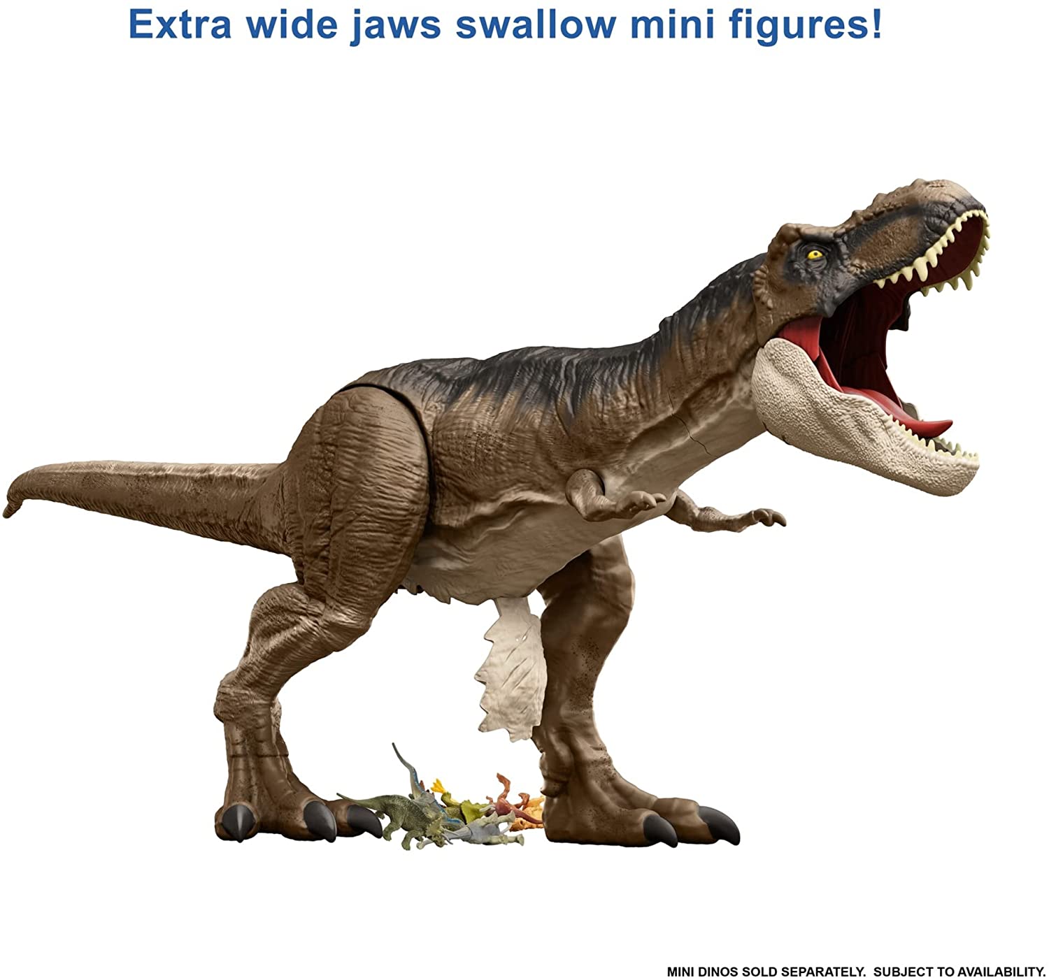 Discover exciting action and adventure with this Super Colossal Tyrannosaurus Rex dinosaur action figure inspired by Jurassic World: Dominion! This T rex comes in a huge size, over 3 feet long. The fun really gets big when kids open their jaws, because this figure can swallow mini figures whole. Pull mini figs out of an existing collection and let the T. rex squash them, then undo the latch on the belly to release them and start a new carnivorous story. It also features authentic sculpting, texture, and color. Makes a great gift for ages 4 and up, especially fans of Jurassic World, dinosaurs, and action games.