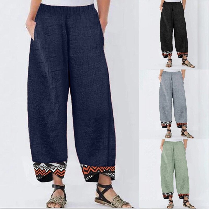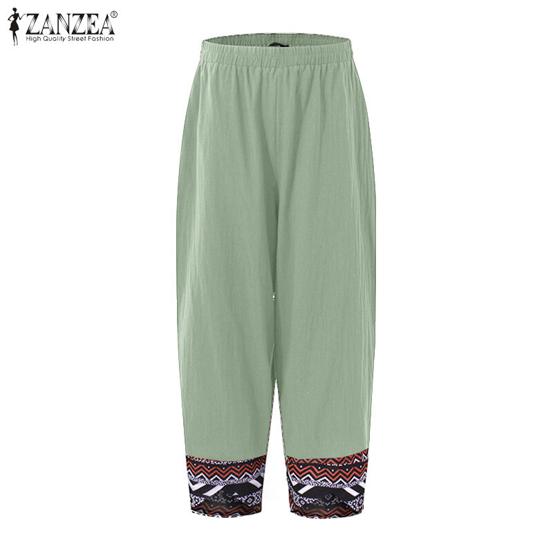 [Clearance Sale]ZANZEA Clearance Sale Womens Summer Elastic Waist Casual Pants Printed Hem Wide Leg Trousers CLE