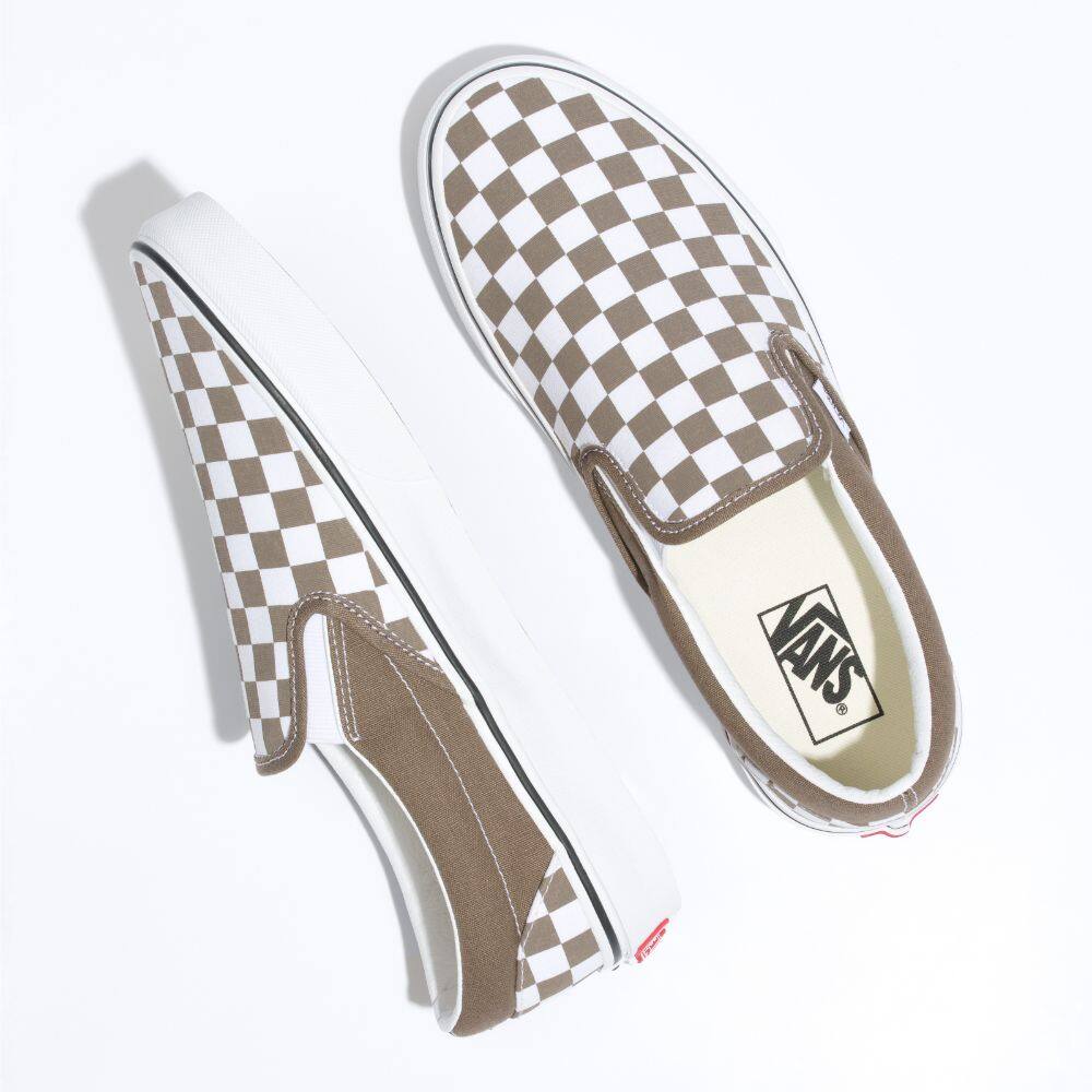 The Color Theory Classic Slip-On features sturdy low profile slip-on canvas uppers with the iconic Vans checkerboard print, padded collars, elastic side accents, and signature rubber waffle outsoles.