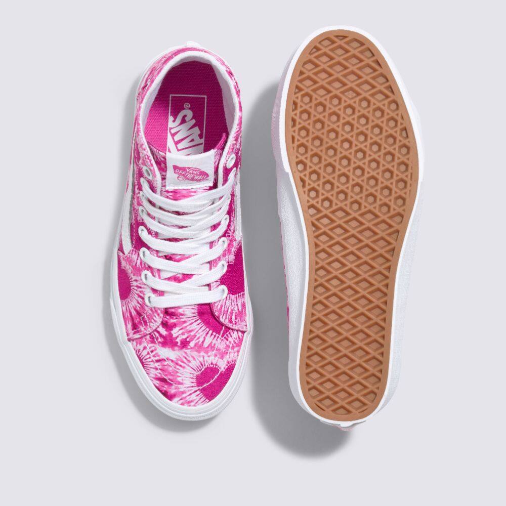 The Tie Dye Hearts Sk8-Hi Tapered, a deconstructed version of our legendary high top, features a more slender and fitted silhouette than the traditional Sk8-Hi. Along with sturdy canvas uppers featuring an allover tie-dyed heart print, this classic sidestripe style comes equipped with metal eyelets and signature rubber waffle outsoles.