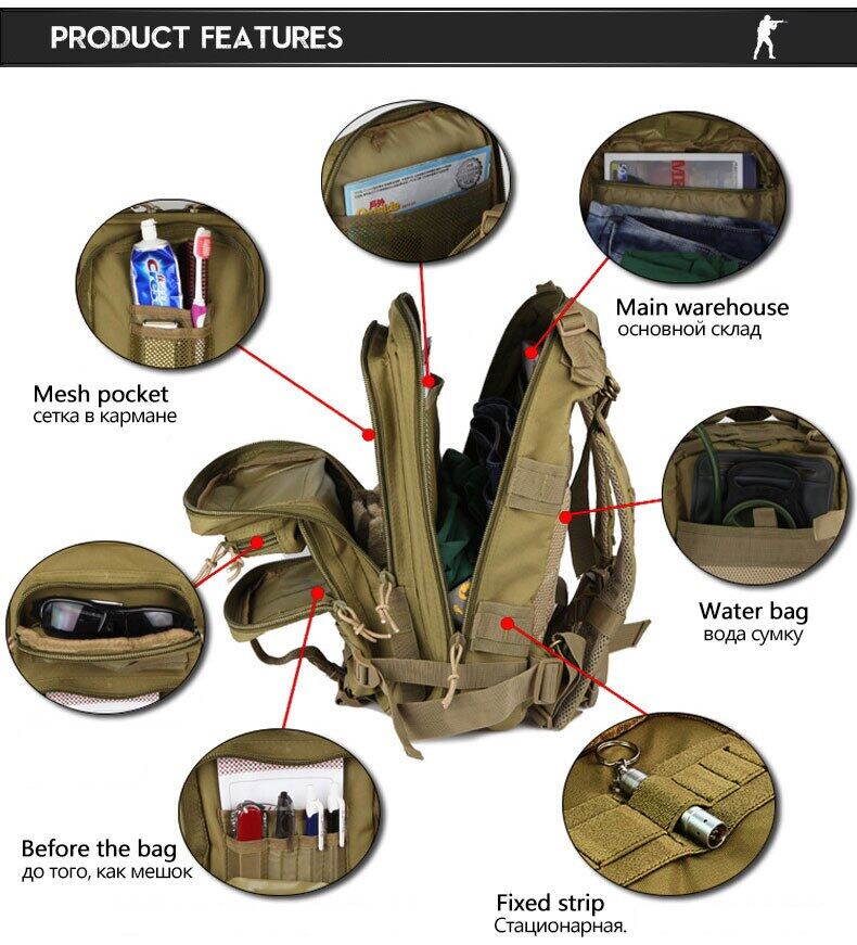 Thickened handle / Shockproof shoulder strap / Main warehouse fasteners / Storage layer / Type D ring / Water-proof fabric / Sturdy buckle / Extension area / Bottom mount