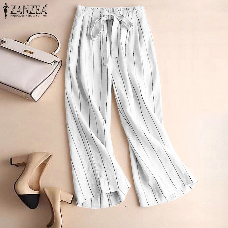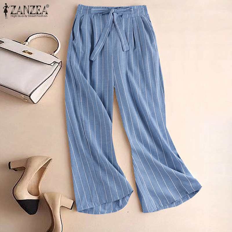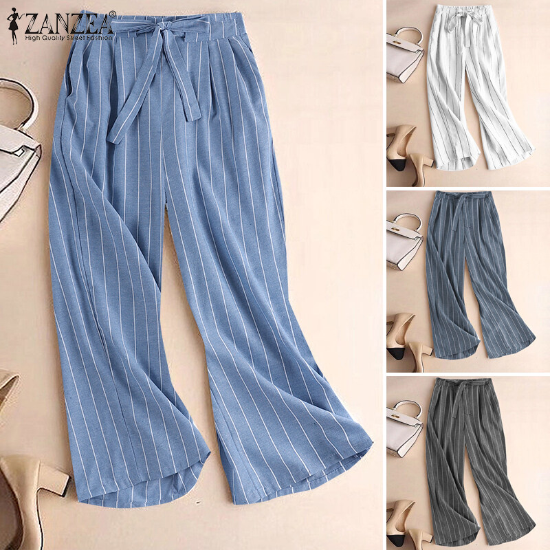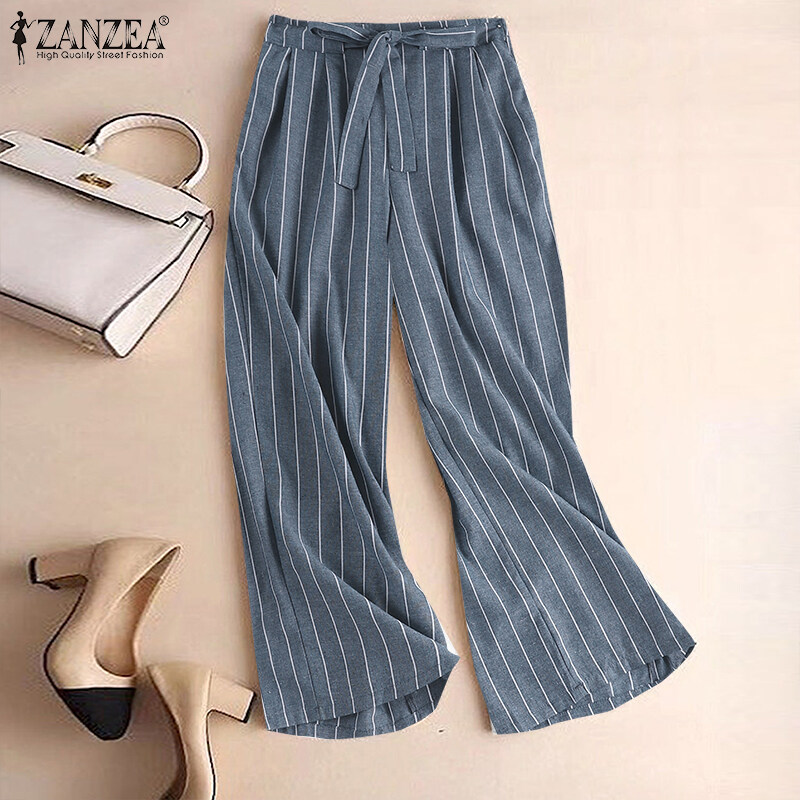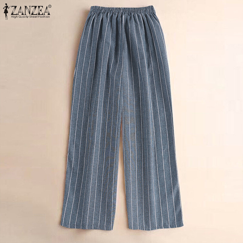 ZANZEA Women's Business Commute Stripe Printed Trousers OL Work Elastic Waist Wide Leg Pants #2
