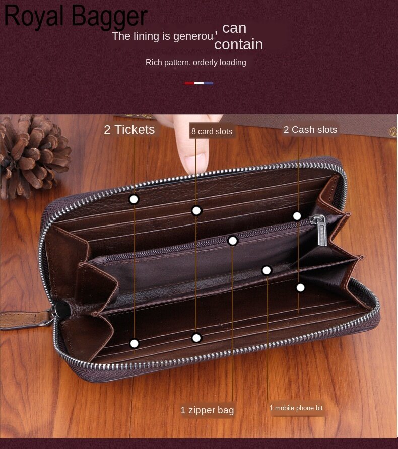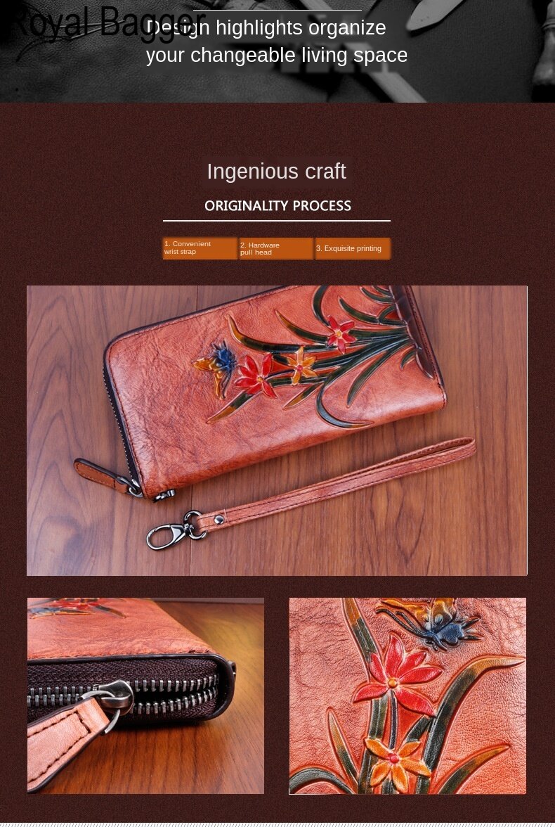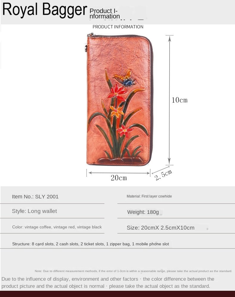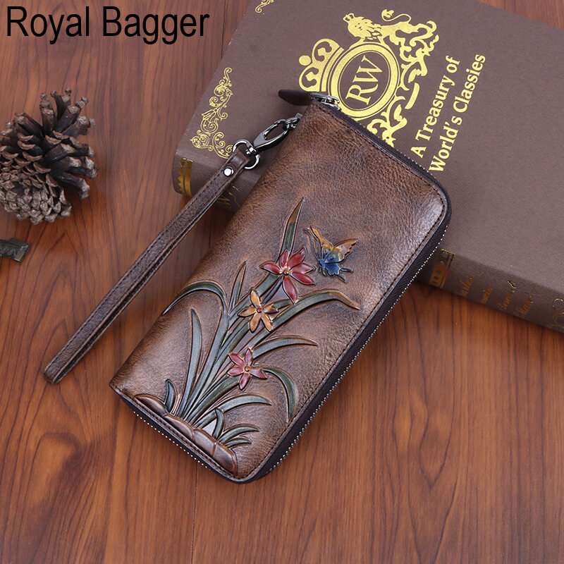Royal Bagger Genuine Cow Leather New Fashion Women Girls Long Wallet Purse Super Hot High Capacity Retro Flower Clutch Bag Handbag Women's Multifunction Bags Casual Multi-Card Position Wallets