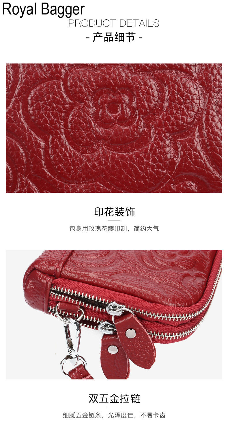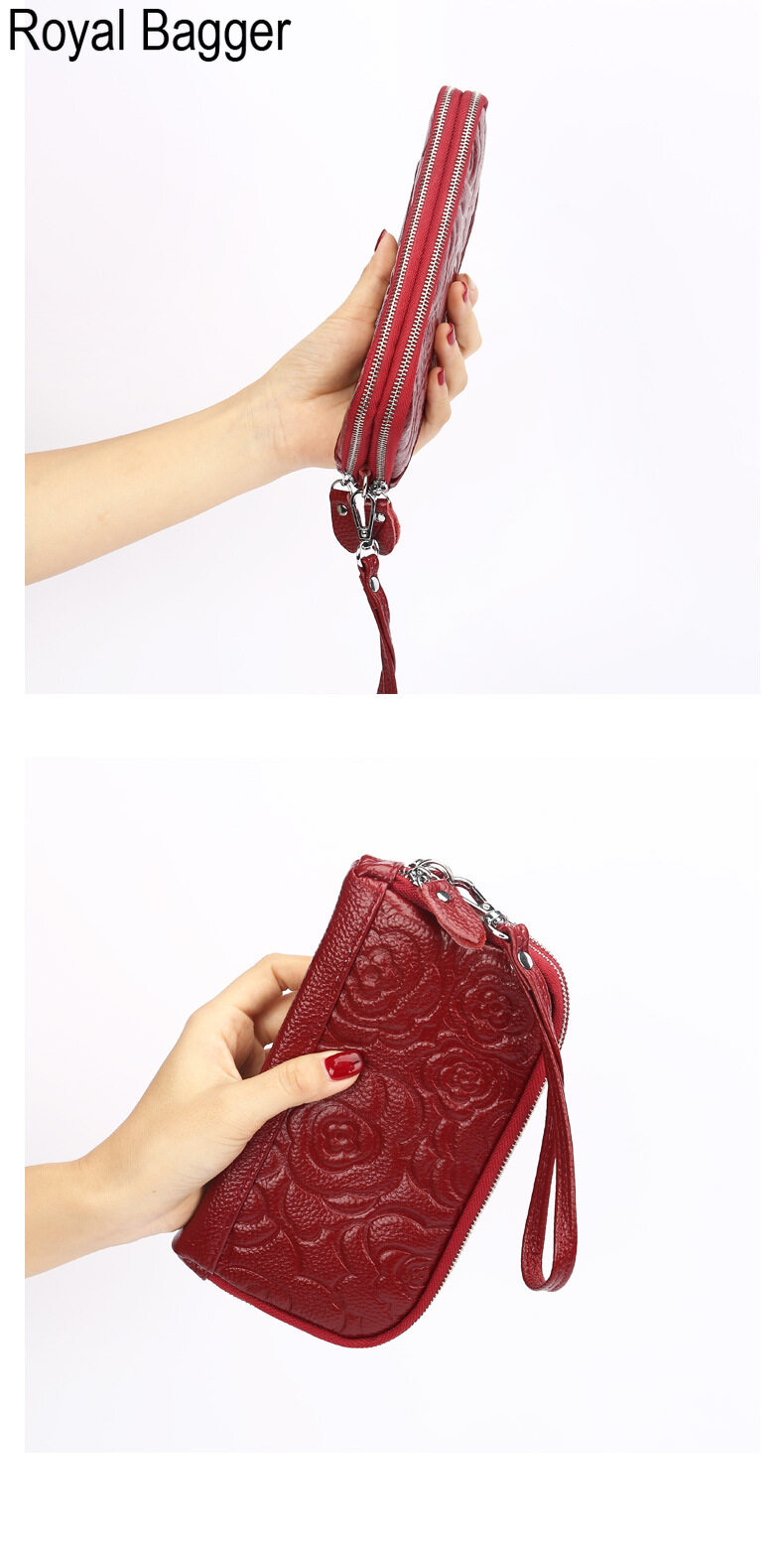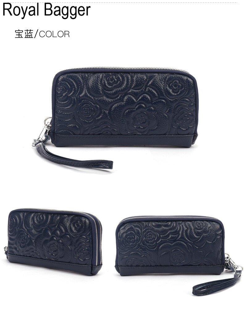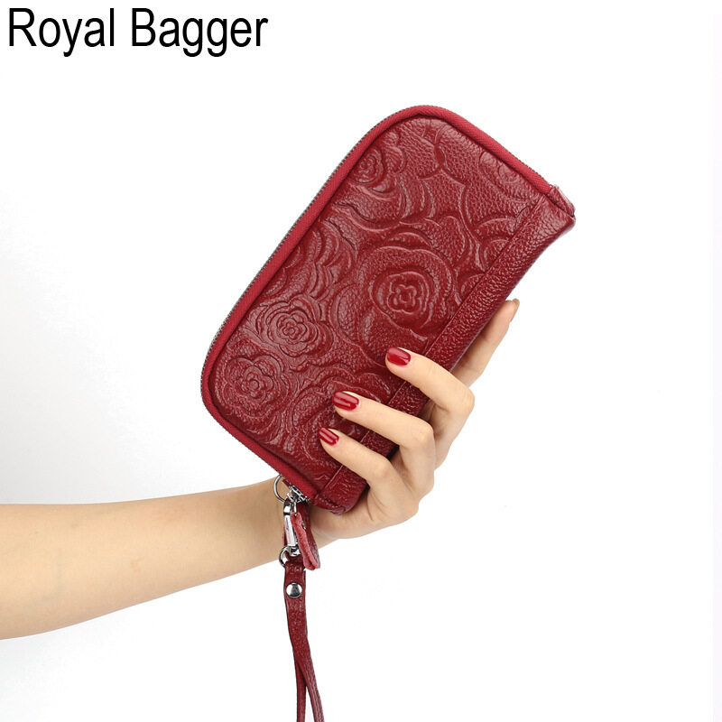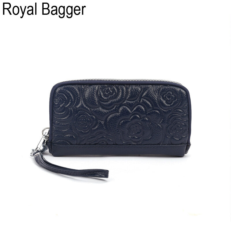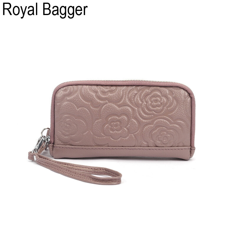 Royal Bagger Genuine Cow Leather New Fashion Double Zipper Flower Long Wallet Purse For Women Girls Super Hot High Capacity Clutch Bag Handbag Women's Multifunction Bags Casual Multi-Card Position Wal